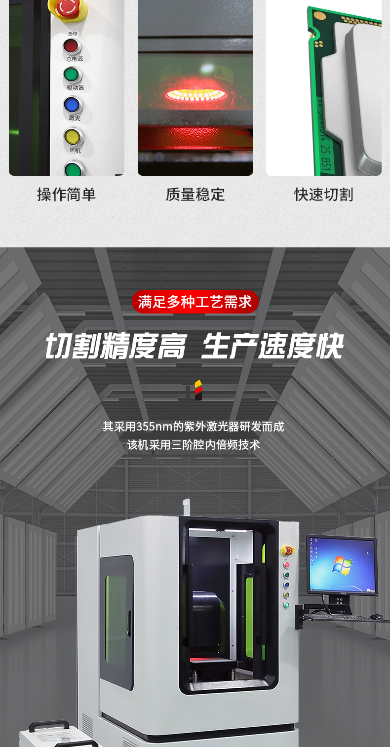 紫外激光切割機屬于激光切割機的系列產品,其采用355nm的紫外激光器研發而成,該機采用三階腔內倍頻技術,同紅外激光比較,355紫外光聚焦光斑極小,能在很大程度上降低材料的機械變形且加工熱影響小,因為主要用于超精細切割、雕刻,特別適合用于食品、醫藥包裝材料打標、打微孔、玻璃材料的高速劃分及對硅片晶圓進行復雜的圖形切割等應用領域。